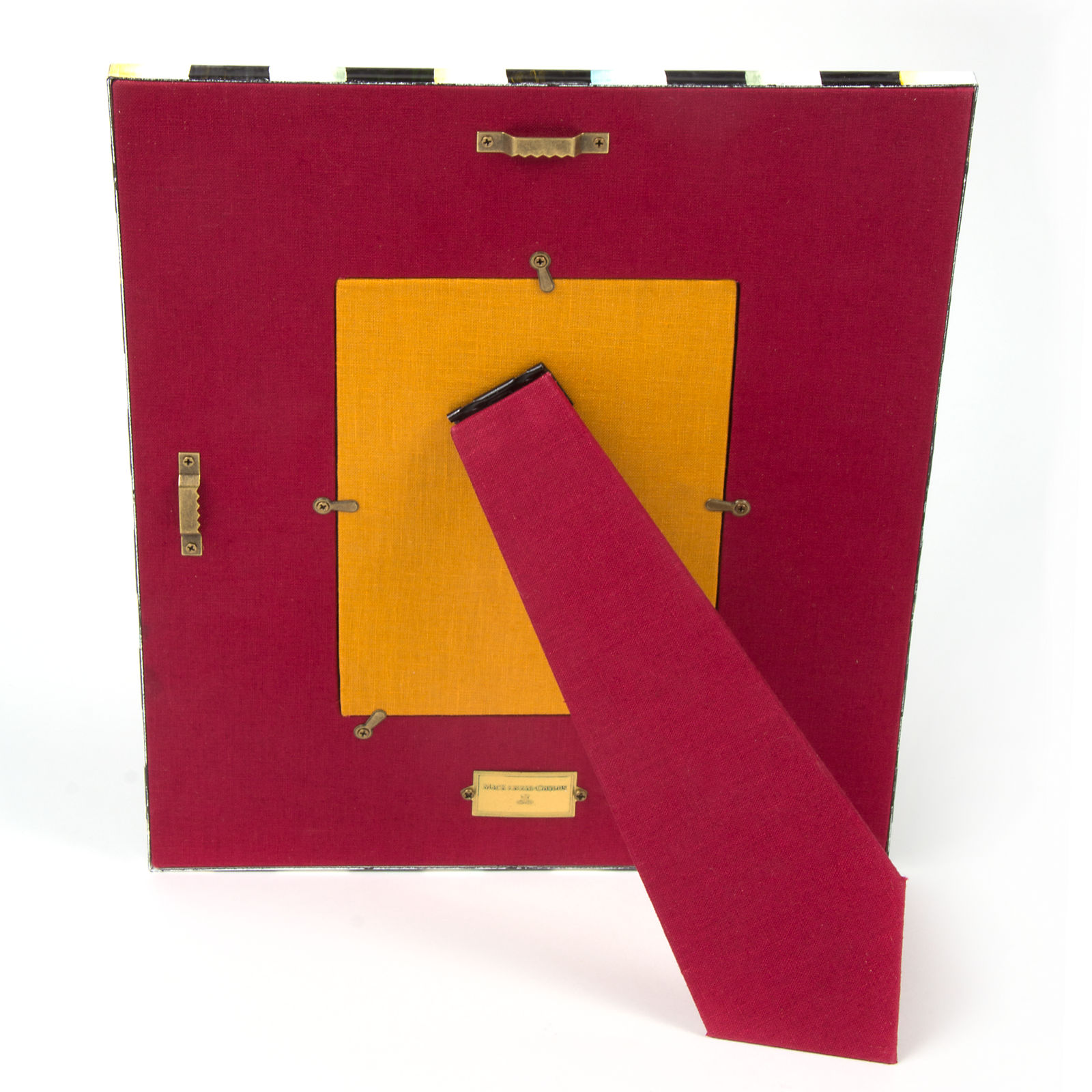Heavy-gauge, hand-glazed steel underbody with hand-painted Courtly Checks. glass pane. Easel back included; backing is covered with two colors of linen and a brass logo plate. Pieces may vary due to the handmade nature of each product. Imported.