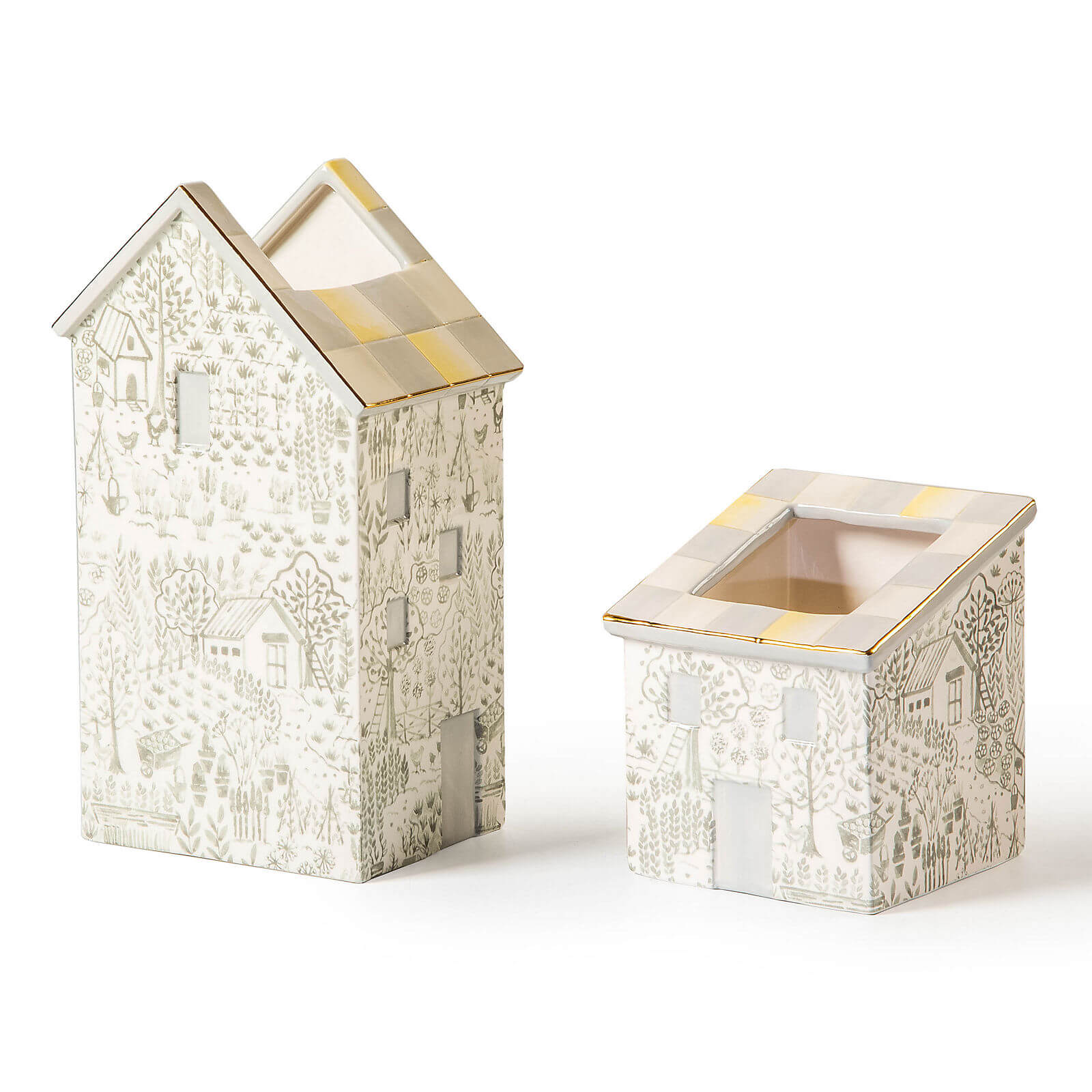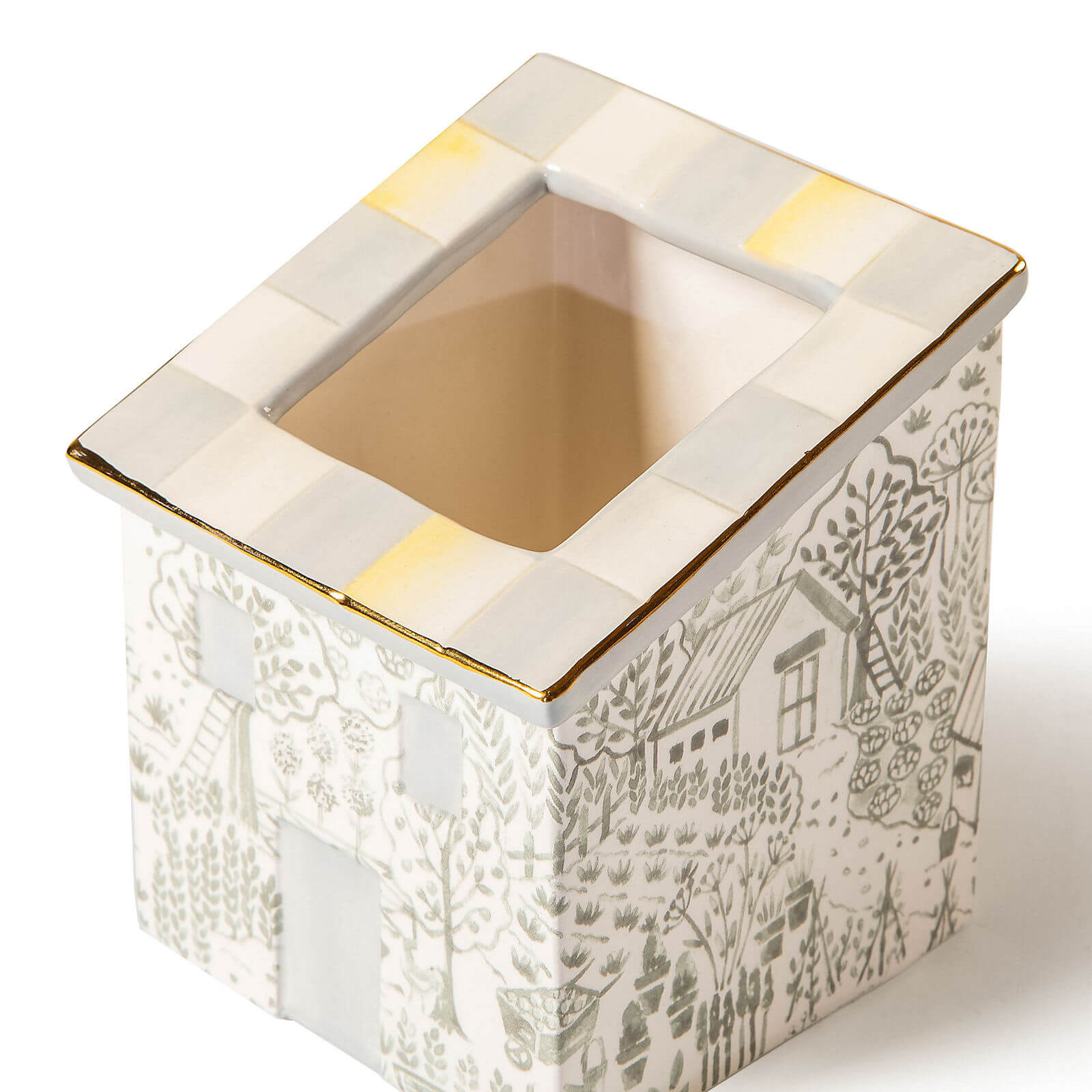 Hold everything from pencils to posies with this short ceramic container, featuring a cottage pattern and trimmed with Sterling Check and gold lustre on the roof.