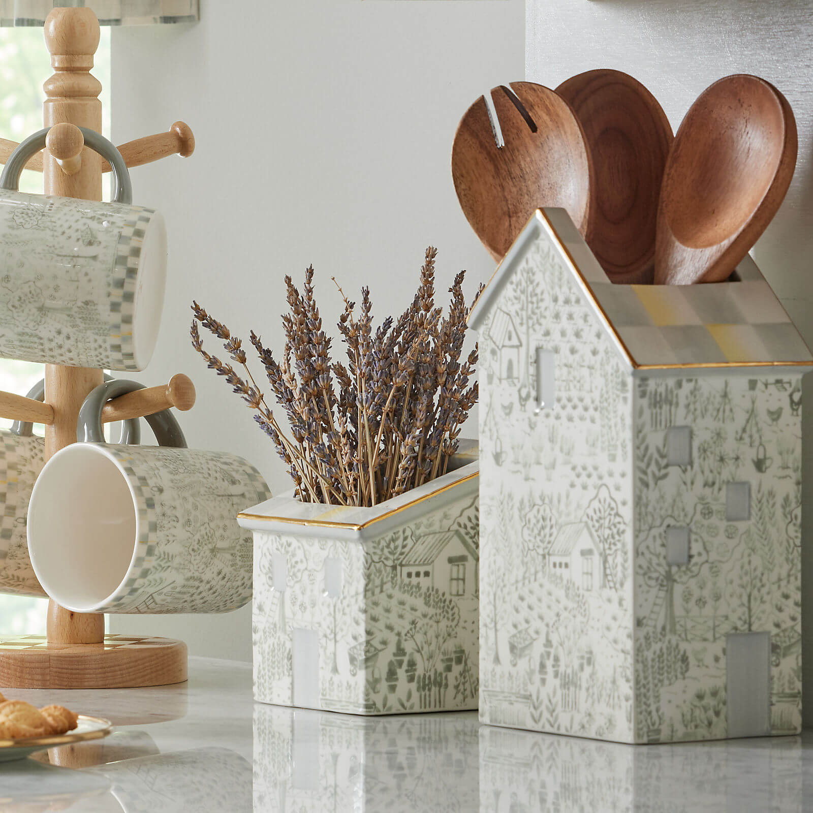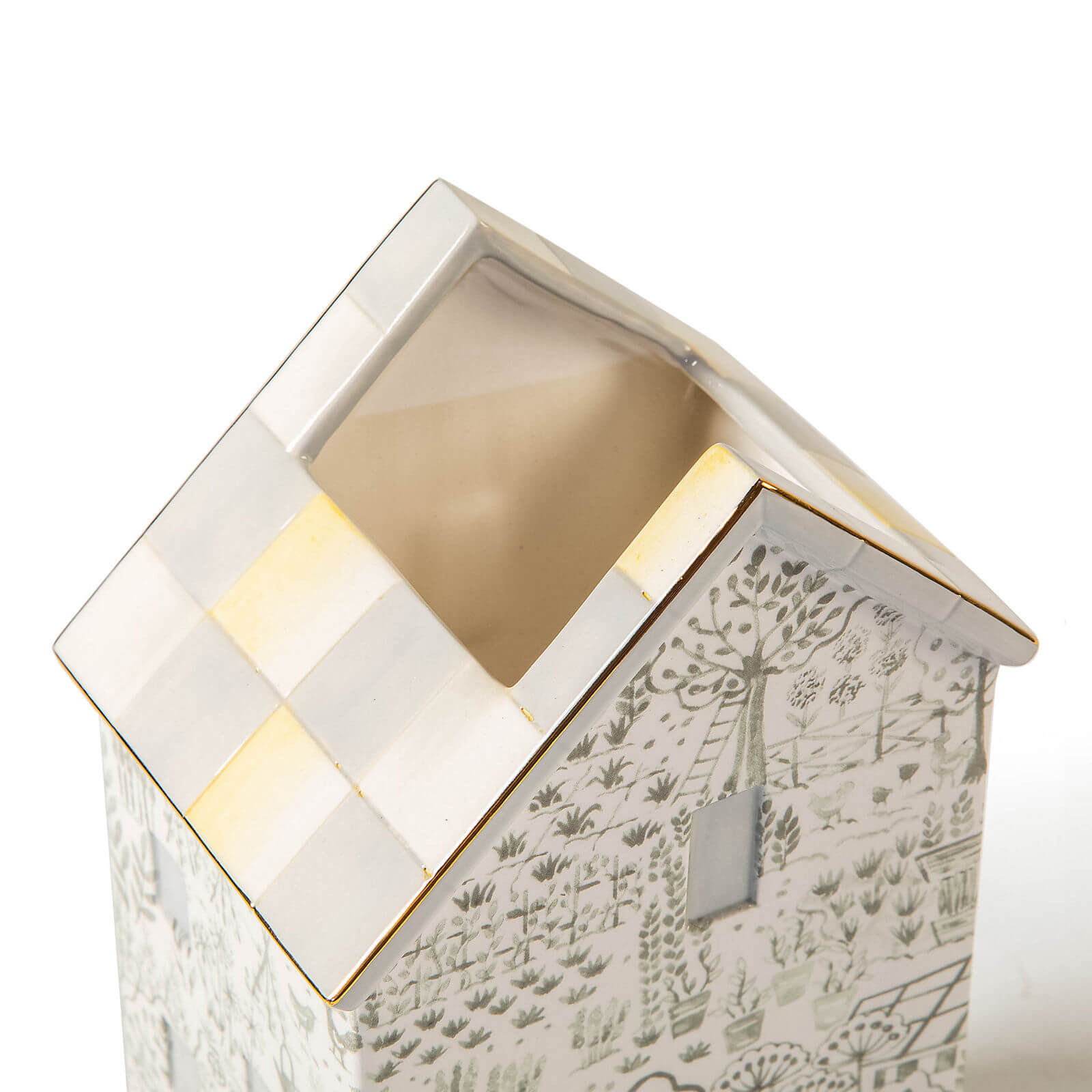 Hold everything from spoons to flowers with this tall ceramic container, featuring a cottage pattern and trimmed with Sterling Check and gold lustre on the roof.