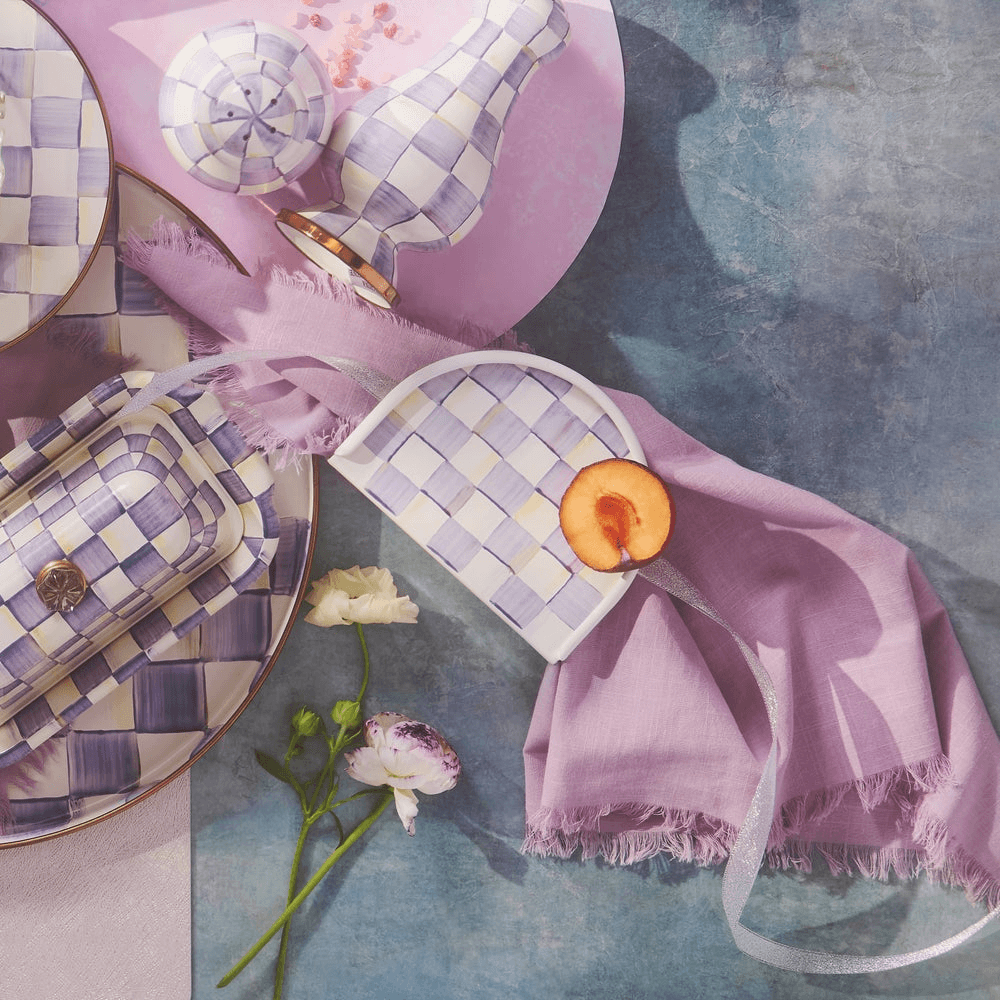 When it comes to staying tidy, our Violet Check Napkin Holder makes table style a snap. It features a heavy-gauge, hand-glazed steel underbody with hand-painted purple checks.