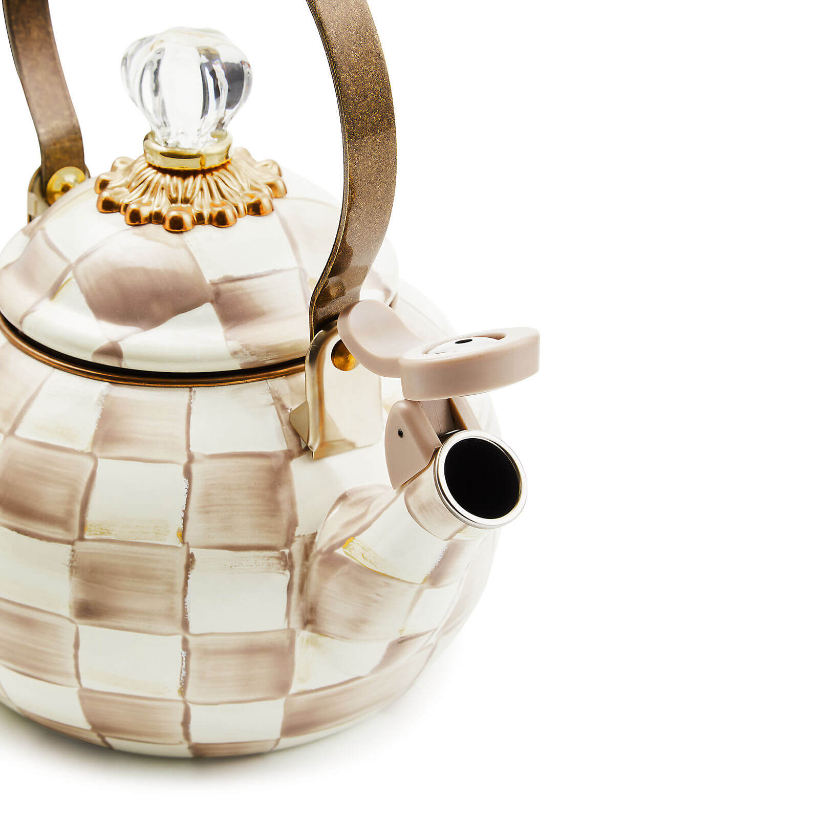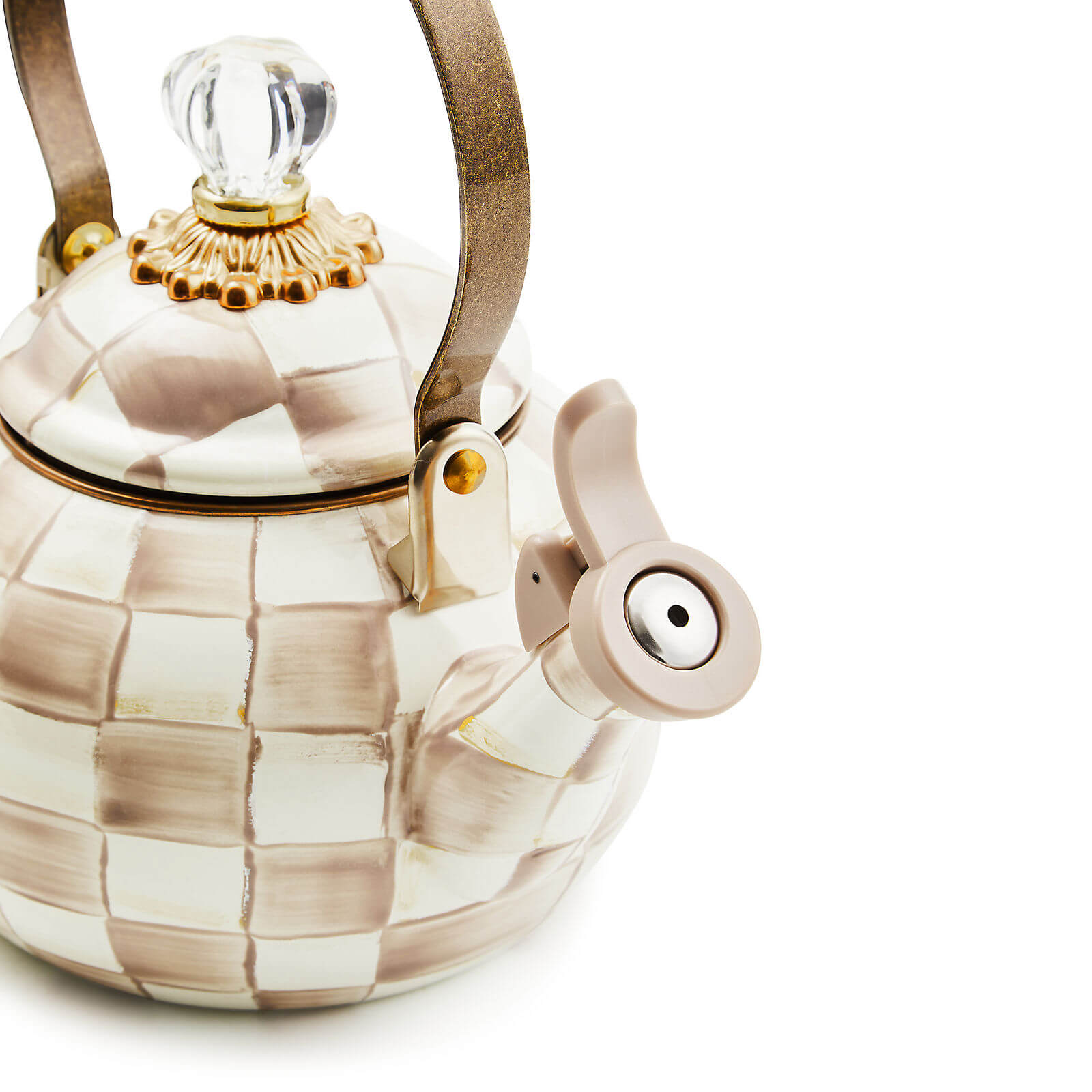 Bubbling over with MacKenzie-Childs style, our Mocha Check Whistling Tea Kettle will tell you when it’s time for tea. The heavy-gauge steel underbody is glazed with hand-painted, coffee-colored checks and topped with an elegant clear glass knob.