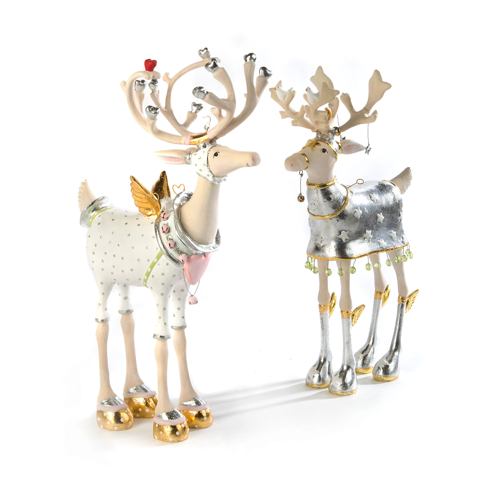 The Patience Brewster Moonbeam Comet Reindeer Figure wears a silver cape glowing with glittering white stars and dangling vintage green glass beads. He has matching celestial winged boots and a gold-leafed moon over his headdress. White doves rest in his antlers as he strives to be Santa’s star reindeer. He runs with St. Nick and the seven other reindeer in the Moonbeam collection.
