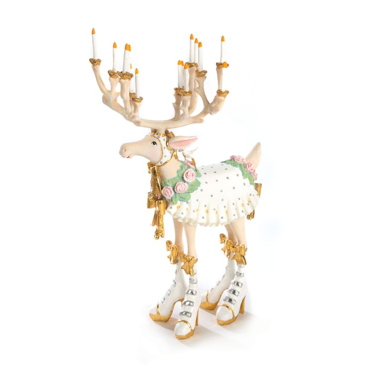 The Patience Brewster Moonbeam Donna Reindeer Figure is bathed in white glittering moonlight, silver, and gold, with wreaths of vintage pink roses and green leaves. She has many candles in her antlers. Pretty, pert, and prepared, she runs even in her platform boots with Santa and the rest of the reindeer in the Moonbeam collection.
